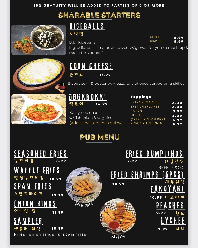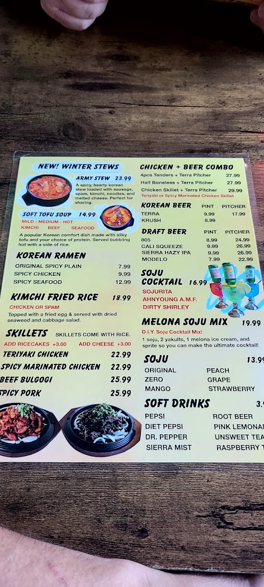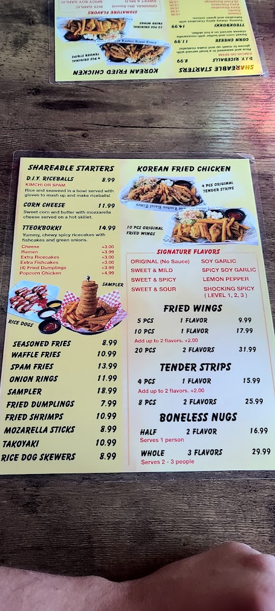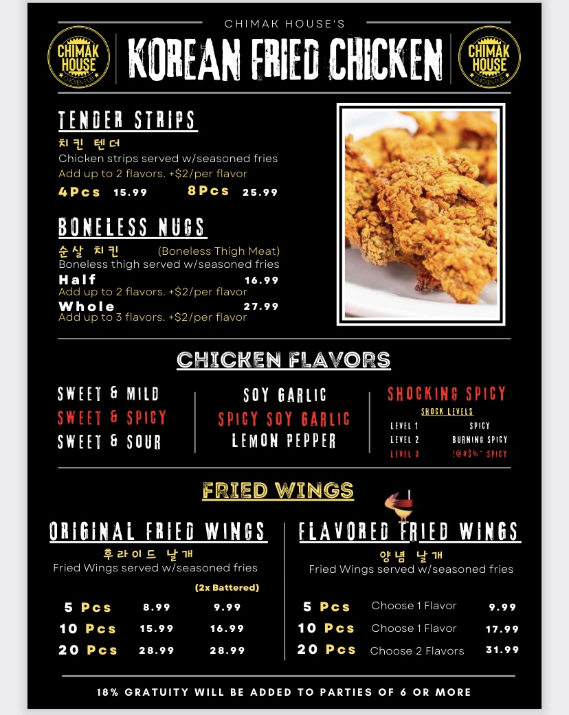 Chimak House Riverside offers a diverse and exciting menu that caters to fans of Korean fried chicken and soul food. For those craving crispy and tender options, the Boneless Nugs are available in Half or Whole portions, while the Tender Strips come in 3, 6, or 9-piece servings. If you’re in the mood for wings, the Flavored Fried Wings are offered in 8, 16, or 24-piece options, delivering the perfect balance of flavor and crunch. The menu also features comforting Korean ramen, including the Original Plain Shin Ramen, Spicy Seafood Ramen, and Spicy Chicken Ramen. For heartier entrées, you can enjoy sizzling skillets such as the Spicy Chicken Teriyaki Skillet, Chicken Teriyaki Skillet, and the Bulgogi Beef Skillet, alongside options like the Spicy Marinated Chicken Skillet and Spicy Pork Skillet. New to the menu are the Winter Stews, including Army Stew and Soft Tofu Soup, ideal for warming up on cooler days. Appetizers like Fried Shrimp, Sampler, and Spam Fries add extra flair, while side dishes such as Cabbage Salad, Pickled Radish, and Rice complement the main offerings. Whether you're here for a quick bite or a satisfying meal, Chimak House Riverside’s menu is sure to offer something that will hit the spot.